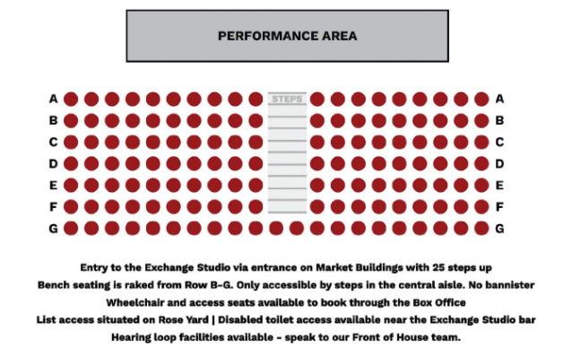 For our Exchange Studio wheel chair spaces must be booked through our box office and limited space will be adjacent to front of the stage or row A can be used for transfers: